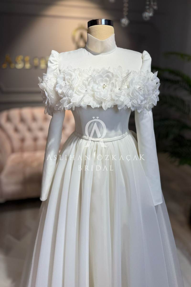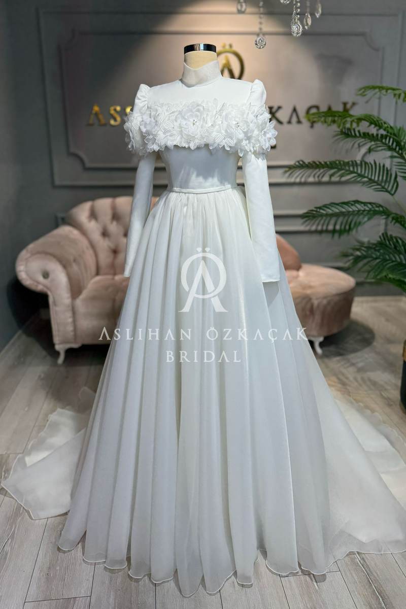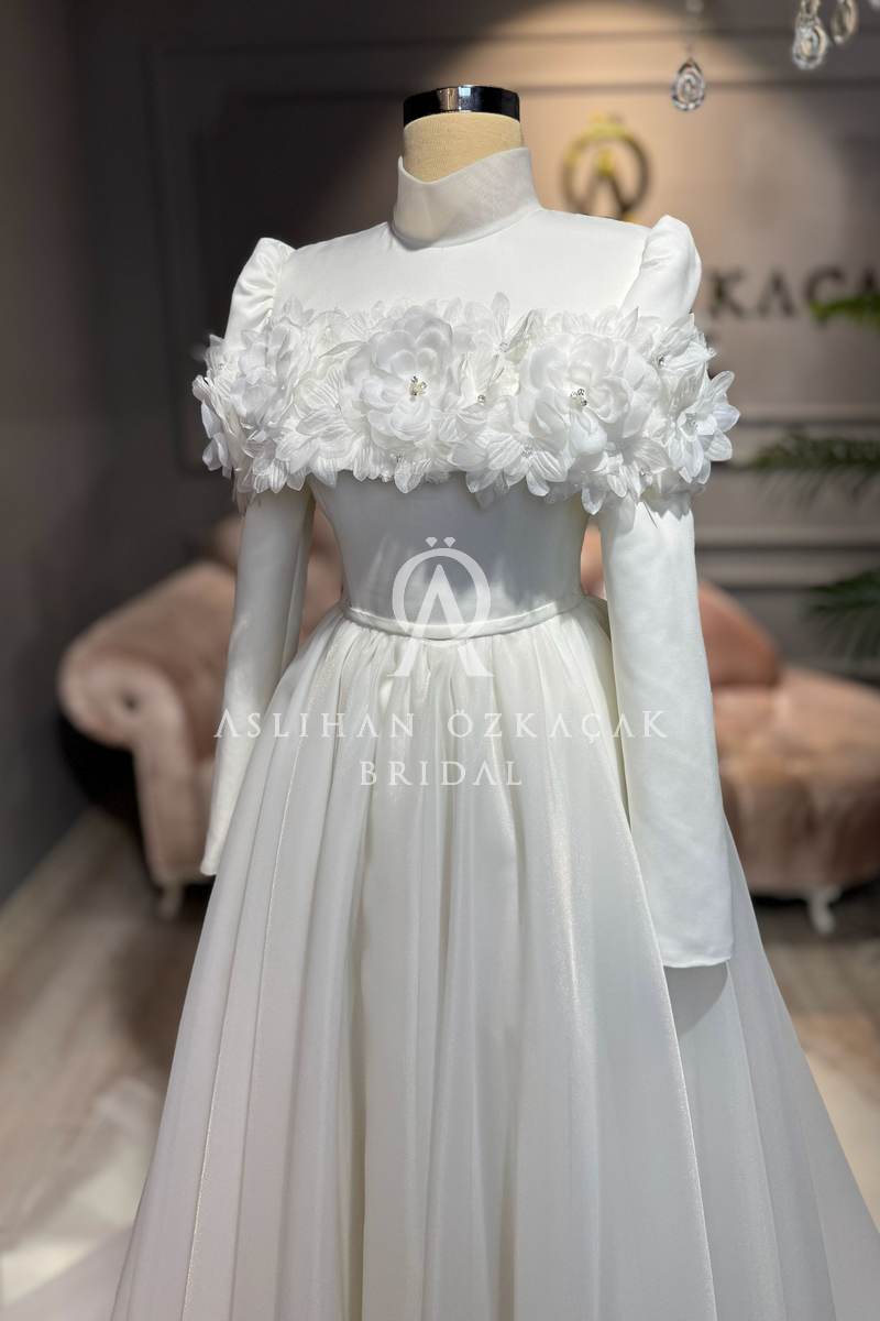 Kullanılan Materyal : yumuşak etek greni , etek ucu greni, grop, balen, 3 boyutlu çiçekli düşük yaka