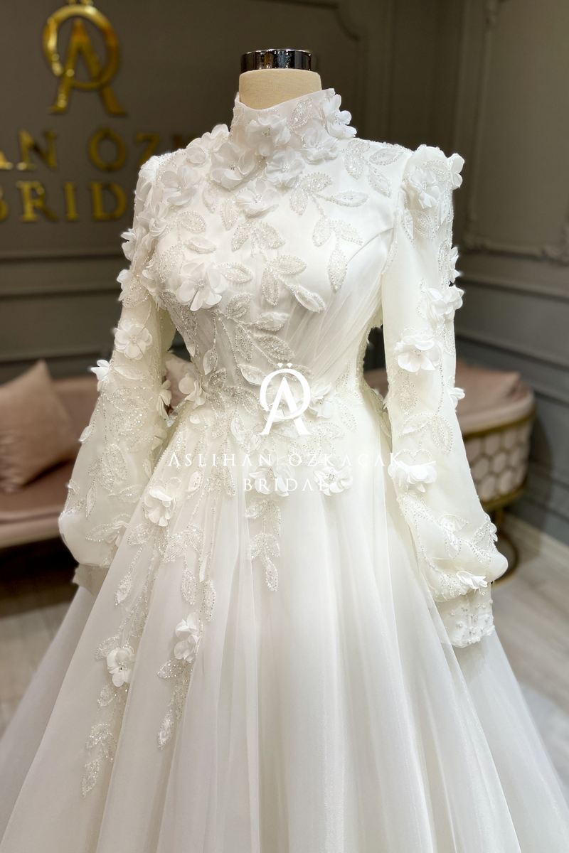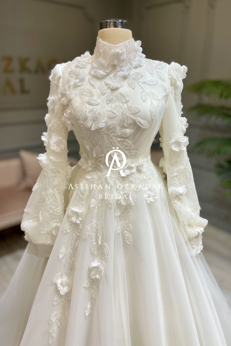 Gelinliğin en dikkat çekici özelliklerinden biri, kullanılan 3 boyutlu danteldir. Bu özel dantel, gelinliğe derinlik ve doku katarken, her bir detayın canlılık kazanmasını sağlar. Dantelin zarif işçiliği, gelinliğin bütününe romantik ve sofistike bir hava k