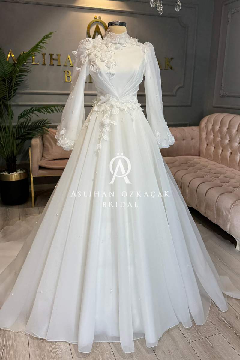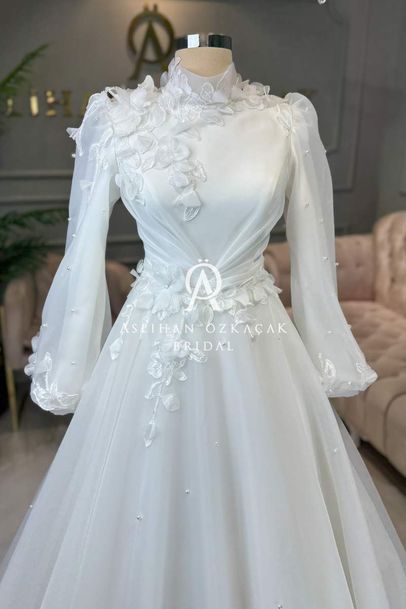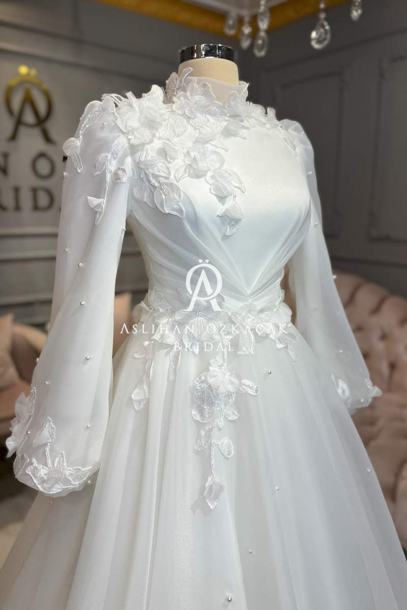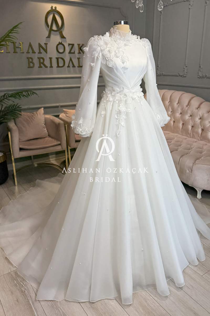 Bu özel tasarımın kalbinde, kullanılan malzemelerin kalitesi ve işçiliği yatar. Gelinliğin en dikkat çekici özelliklerinden biri, kullanılan 3 boyutlu danteldir. Bu dantel, gelinliğe derinlik ve görsel bir zenginlik katarak, adeta canlı bir sanat eseri görünümü verir. Grop, balen gibi materyaller, gelinliğin formunu korumasına ve vücutta kusursuz durmasına yardımcı olurken, hayal tül, mat saten ve kristal saten gibi farklı dokular, tasarıma katmanlı bir estetik kazandırır.