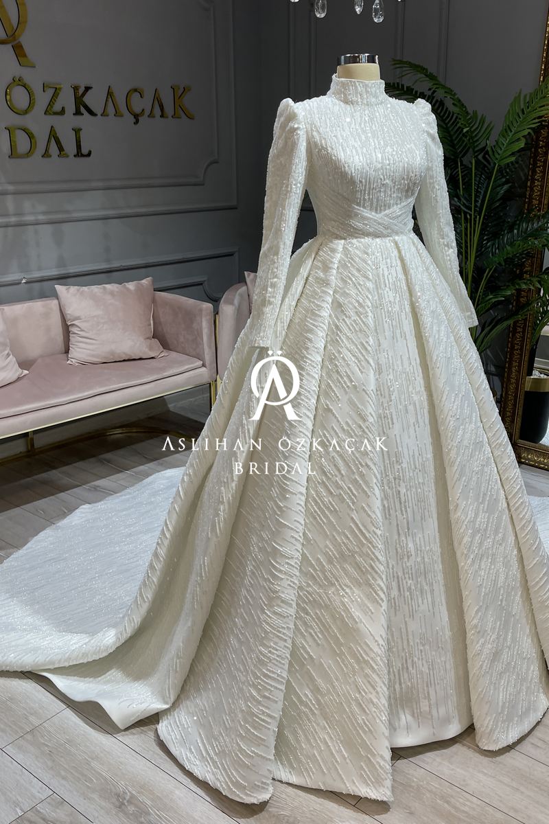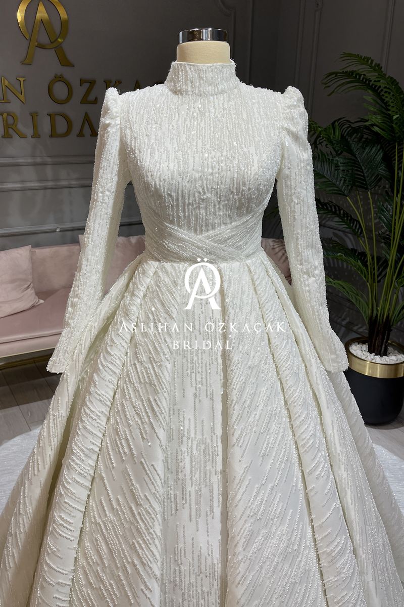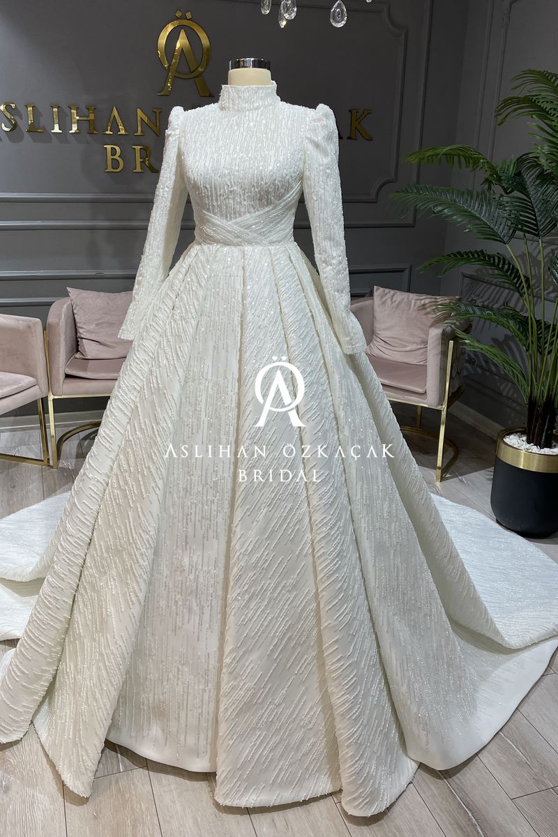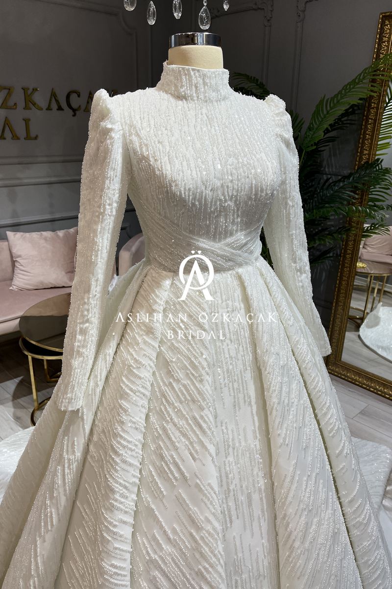Hayallerinizdeki zarafeti ve asaleti yansıtan Pera Kasnak İşlemeli Tesettür Gelinlik Modeli, en özel gününüzde size eşlik etmek için tasarlandı. Bu büyüleyici gelinlik, geleneksel zanaatkarlığı modern çizgilerle birleştirerek, tesettürlü gelinlerin tüm beklentilerini karşılayan eşsiz bir parça sunuyor. Her detayı özenle düşünülmüş Pera modeli, sadece bir gelinlik değil, aynı zamanda bir sanat eseri niteliği taşıyor.